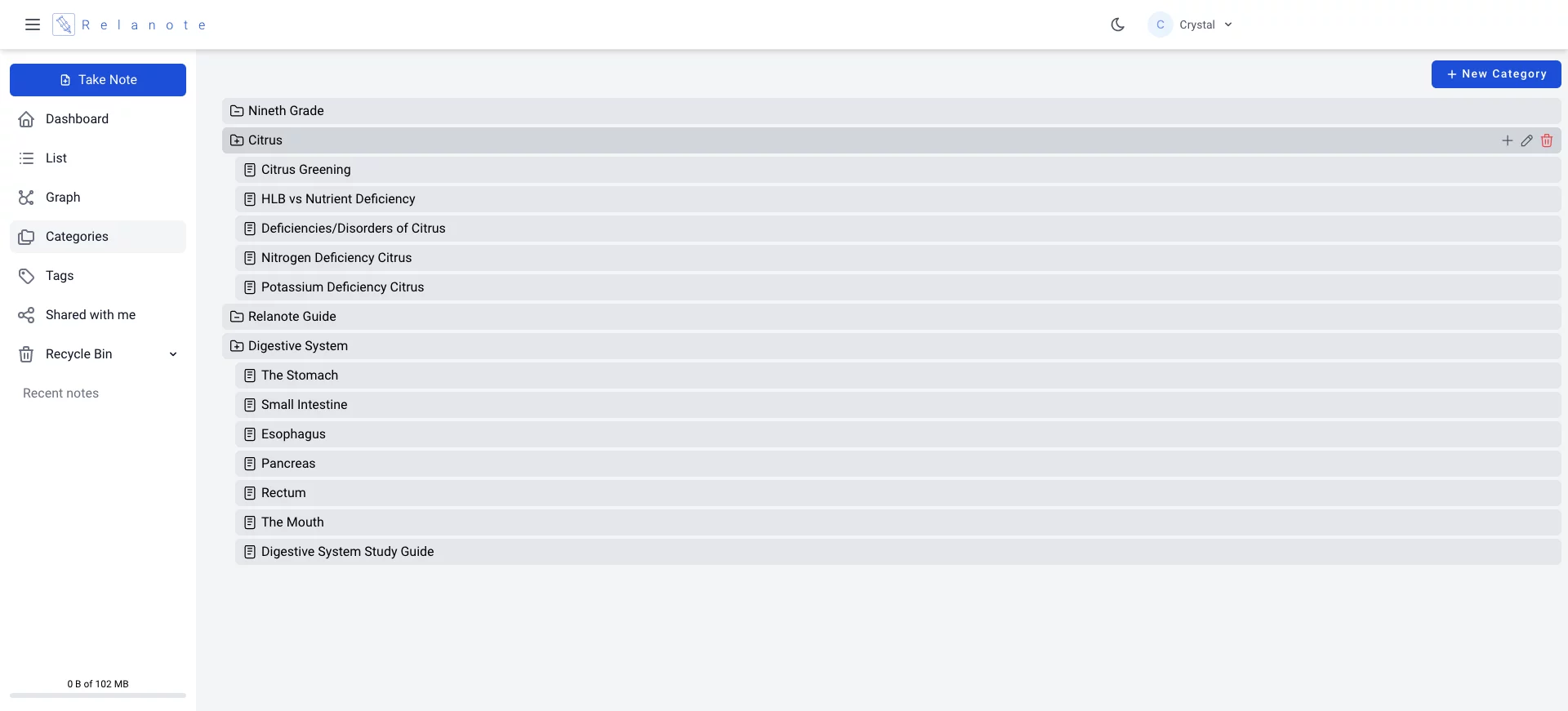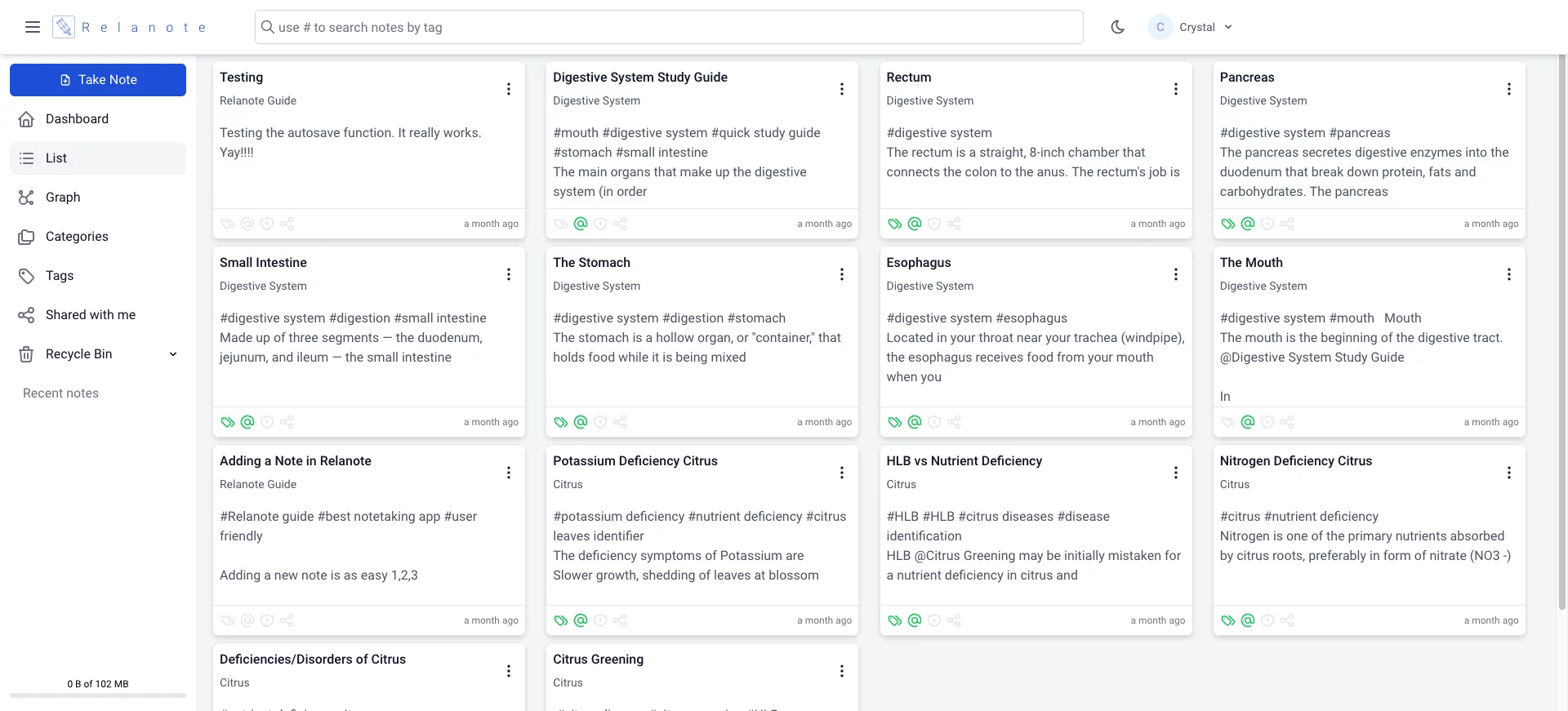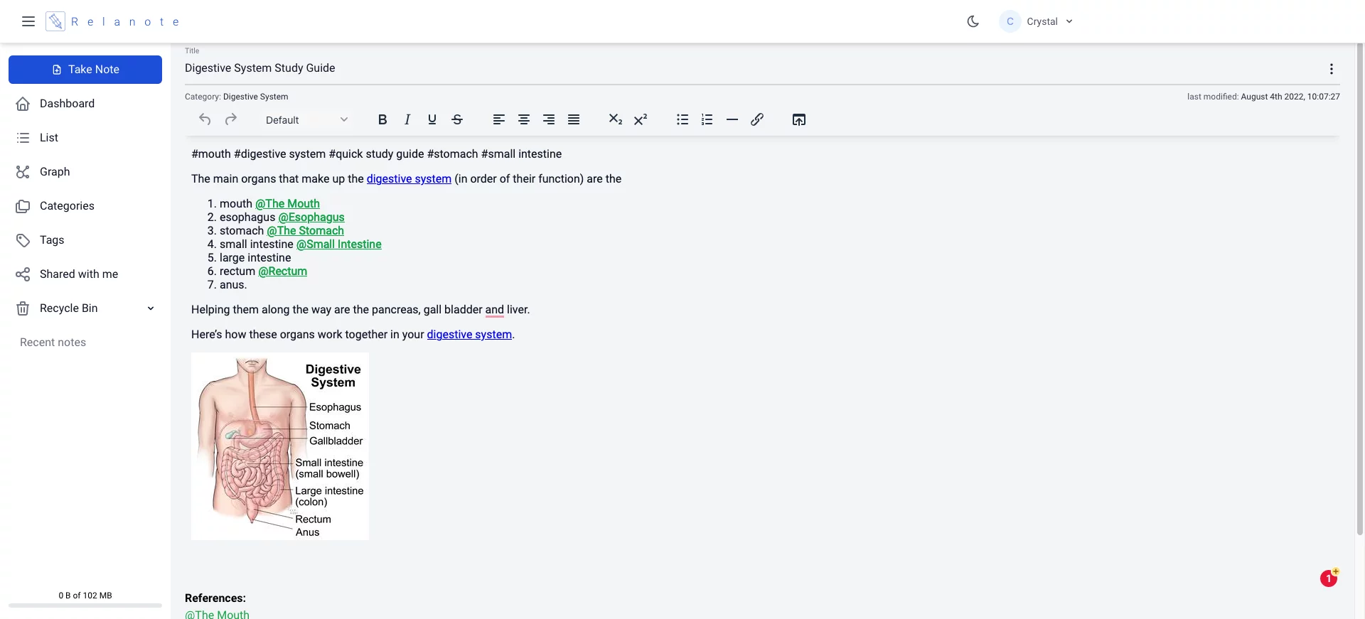 Let’s say I need to prepare for a biology test on the digestive system. I can transfer all my notes to one long page in Relanote. Truthfully, it will be a very long page that will be discouraging when it’s time to review.