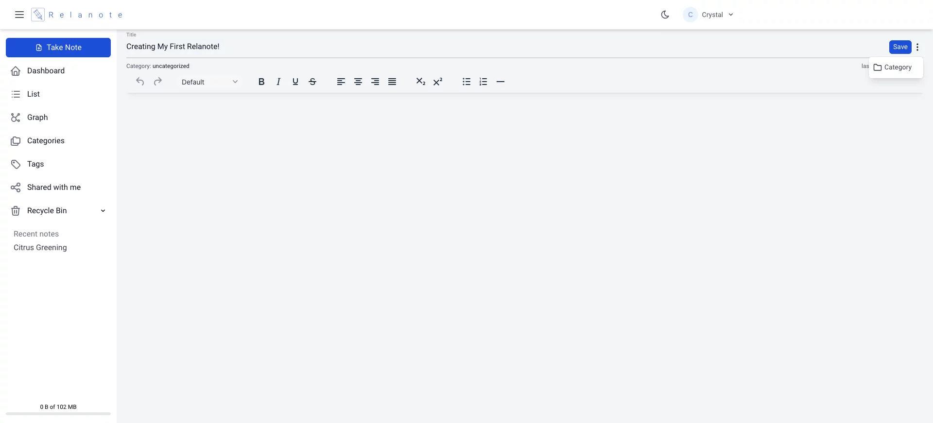 The Save button on the right saves your note using the title used. Relanote will Autosave your note as you continue to work on it.